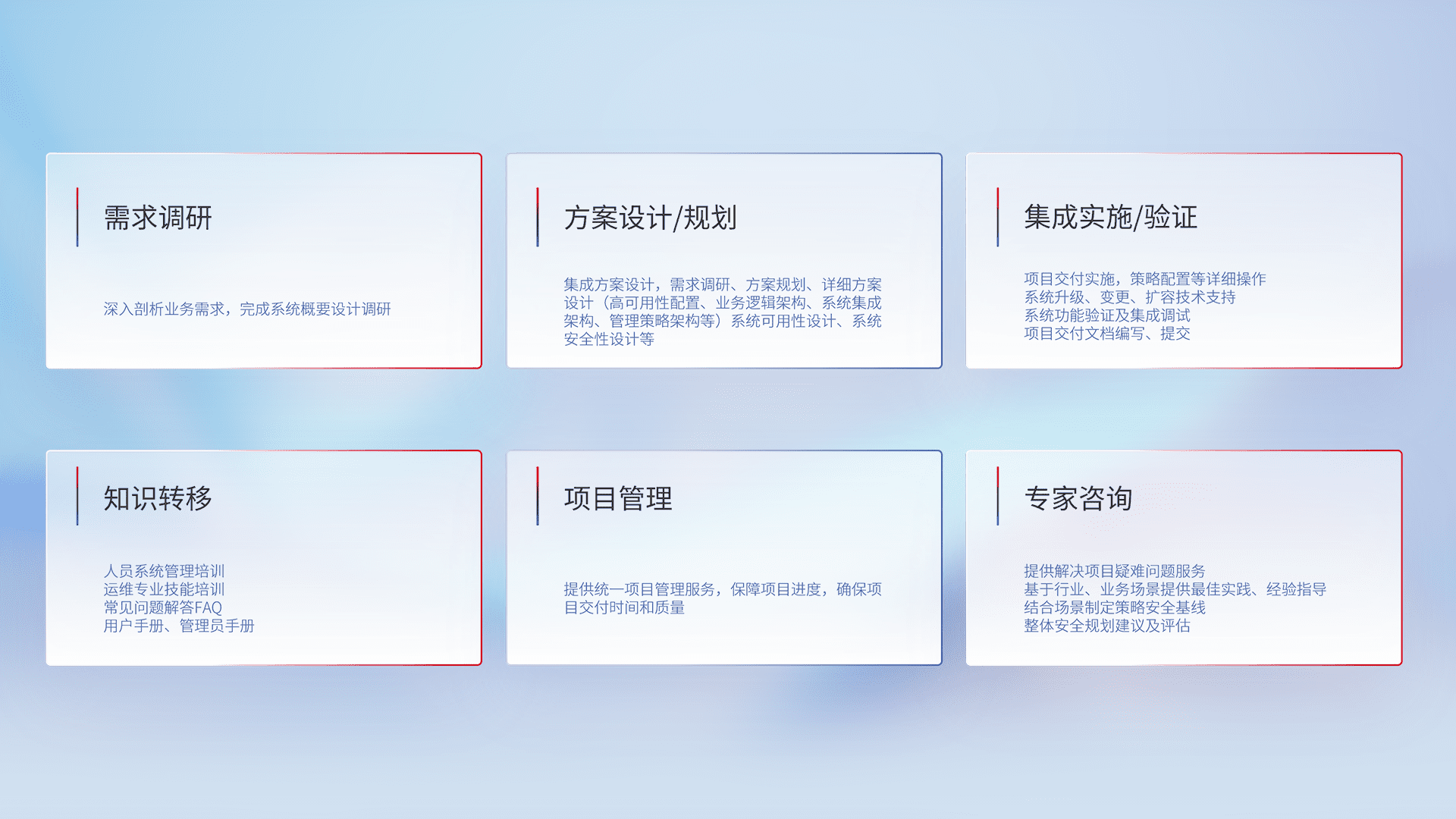 针对客户行业特性,,,,将宏观的安全战略和需求,,通过专业的交付服务,,,实现项目落地,,为客户提供标准规范的集成交付服务。。。